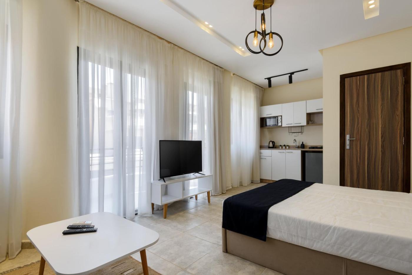 Studio. The studio provides air conditioning, a tea and coffee maker, as well as a private bathroom featuring a bath and a shower. The well-equipped kitchen features a stovetop, a refrigerator, kitchenware and a microwave. The studio has carpeted floors, a seating area with a flat-screen TV, a dining area, a wardrobe as well as garden views. The unit offers 1 bed. ;