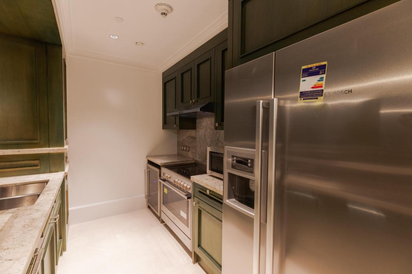 The apartment is composed of 1 bedroom, a fully equipped kitchen, and 2 bathrooms. A flat-screen TV is featured.