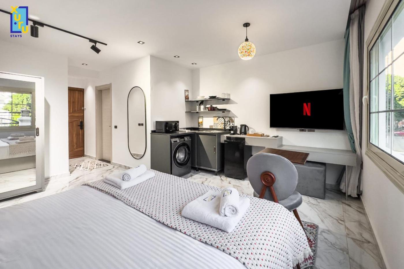 Studio. The spacious studio offers air conditioning, a washing machine, as well as a private bathroom boasting a bath and a shower. Guests can make meals in the kitchen that has a stovetop, a refrigerator, kitchenware and a microwave. The studio provides a coffee machine, a dining area, a wardrobe, heating, as well as a TV with cable channels. The unit has 1 bed.